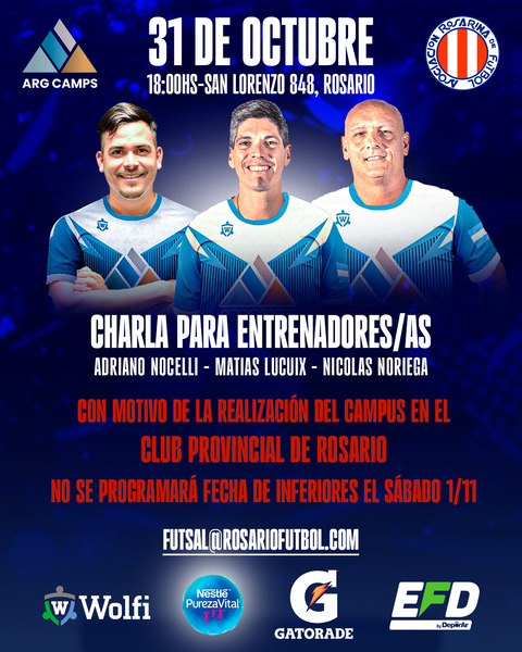 El próximo viernes 31 de octubre Matías Lucuix, entrenador de la Selección Argentina de Futsal Masculino; Nicolás Noriega, entrenador de la Selección Argentina de Futsal Femenino; y Adriano Nocelli, entrenador de la Primera División del club Ferro, estarán presentes en la Asociación Rosarina de Fútbol brindando una charla exclusiva para técnicos y técnicas de nuestros clubes de futsal.